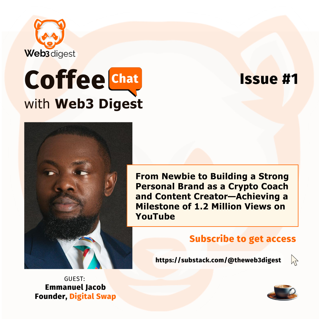 In this inaugural edition of Coffee Chat with Web3 Digest, we had the privilege of sitting down with Emmanuel Jacob, a crypto coach, content creator, and the visionary behind Digital Swap. Emmanuel takes us through his inspiring journey—from being a crypto newbie to building a thriving personal brand, empowering others, and achieving an incredible milestone of 1.2 million views on YouTube.
